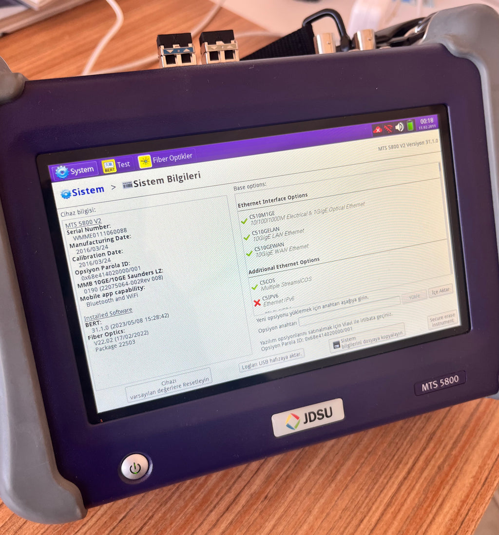 2. El ve az kullanılmış MTS-5800 el tipi test cihazı ile metro, core, mobile backhaul ve omurga ağlarına yönelik pek çok test gerçekleştirilebilir. Ethernet, bant genişliği, TrueSpeed ve sanal ağ trafiği testleri yapabilir. Arkasına takılan modül ile OTDR testleri gerçekleştirebilir. Üzerindeki opsiyonlar fotodan görünebilir. Cihazın üzerinde 1G ve 10G testleri aktif olup PDH ve SDH testleri için ilave yazılım opsiyonu satın almak gereklidir.